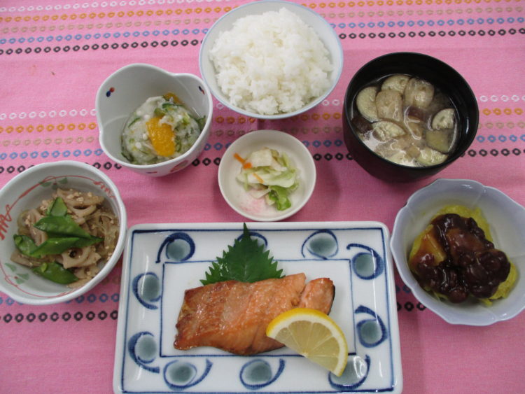 ご飯、なすと油揚げのみそ汁、ますのレモン風味焼き、春雨とれんこんのソテー、さつま芋のいとこ煮、しらすとオクラのおろし和え、キャベツ漬