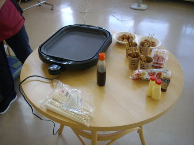 屋台メニューは焼きそば、焼き鳥、たこ焼き、フランクフルトを提供しました。お客様に好きなメニューを選んでもら
