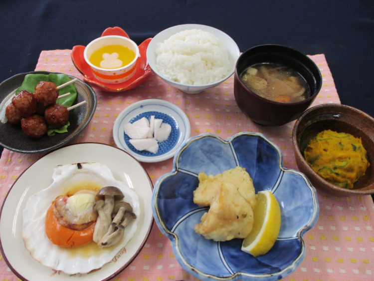 ご飯、けんちん汁、赤魚の磯部揚げ、南瓜とハムのサラダ、つくね串、帆立のバター醤油焼き、長芋漬、十五夜ゼリー