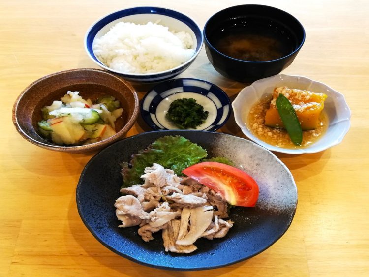 ごはん、岩のりのみそ汁、豚肉の山椒焼き、南瓜のそぼろ煮、りんごなます、しその実漬け