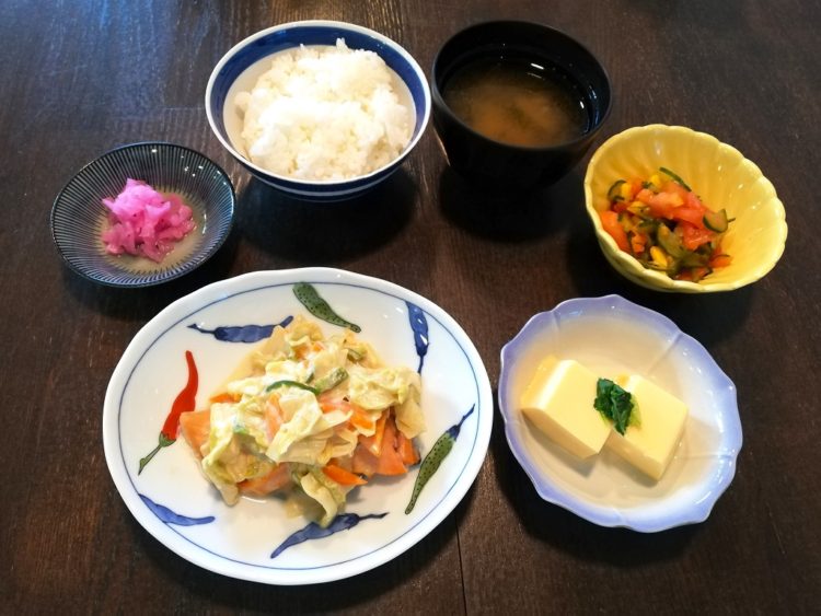 ごはん、わかめのみそ汁、鮭のチャンチャン焼き風、たまご豆腐、トマトサラダ、桜大根漬け