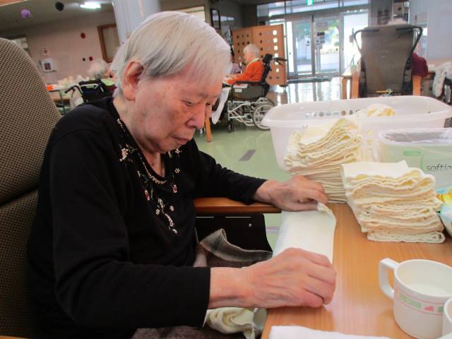 M様がタオル畳みを朝から手伝ってくれています。