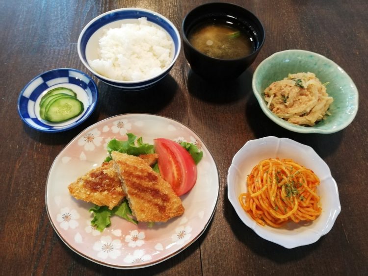 ごはん、オクラのみそ汁、白身魚フライ、ナポリタン、大根のサラダ、きゅうり漬け