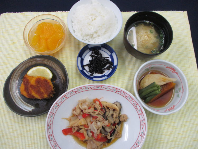 ご飯、かきたま汁、豚肉とたけのこの中華炒め、南瓜と笹かまの炊き合わせ、帆立風味フライ、しそ昆布、みかん缶