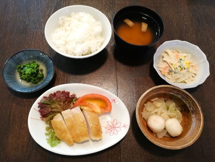 ごはん、もやしのみそ汁、鶏肉の照り焼き、大根のうま煮、ごぼうのサラダ、しその実漬