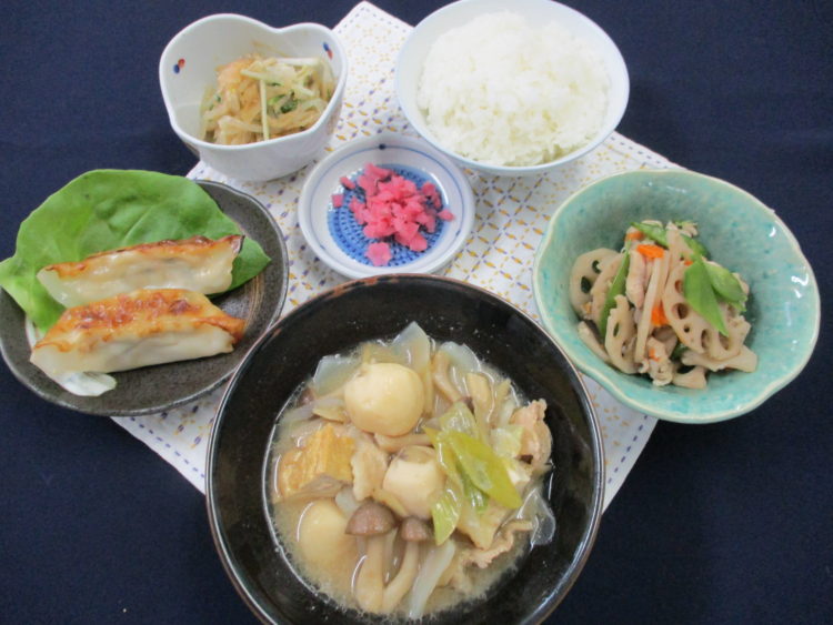 ご飯、芋煮、れんこんと鶏肉の炒り煮、焼き餃子、水菜ともやしの和え物、梅吹雪漬