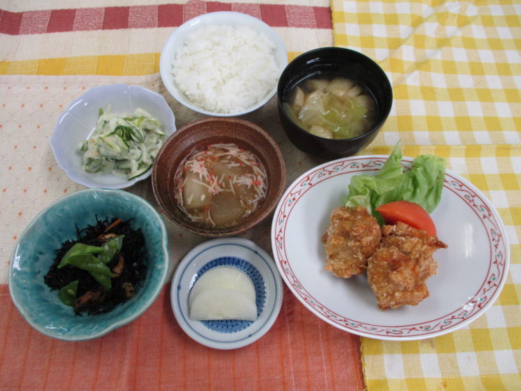 ご飯、キャベツと油揚げのみそ汁、鶏肉の竜田揚げ、ひじきと大豆の炒め煮、冬瓜のかにあんかけ、アスパラとツナのごまサラダ、べったら漬