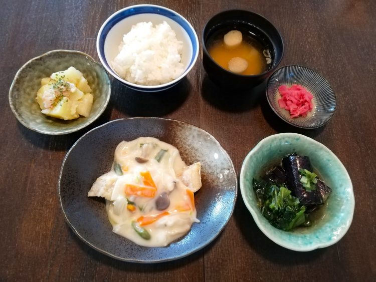 ごはん、麩のみそ汁、たらのホワイトソースがけ、ジャーマンポテト、なすの煮浸し、梅吹雪