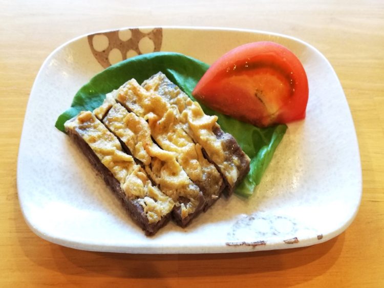 ごはん、麩のすまし汁、牛肉のピカタ、人参の子和え、オクラの和え物、まつば昆布