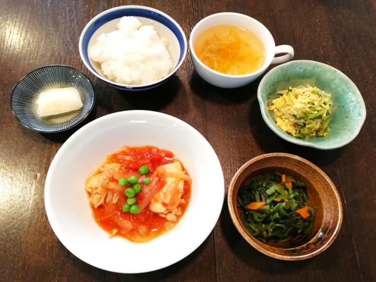 ごはん、キャベツのスープ、若鶏のトマト煮、ほうれん草のソテー、もやしの和え物、べったら漬