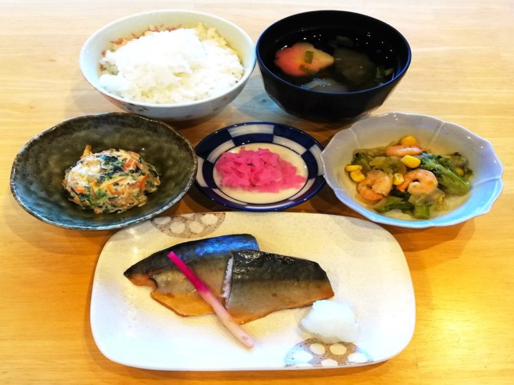 ごはん、花麩のすまし汁、さばの照り焼き、ブロッコリーの炒め物、舞茸の白和え、桜大根漬け