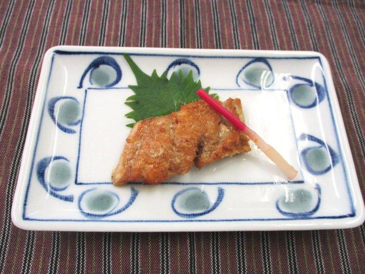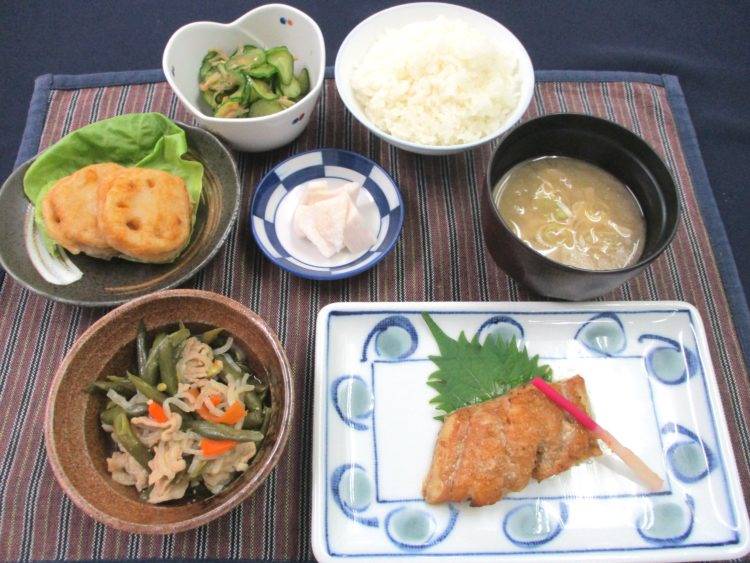 ご飯、舞茸とねぎのみそ汁、めばるのごまダレ焼き、いんげんと豚肉の炒め物、