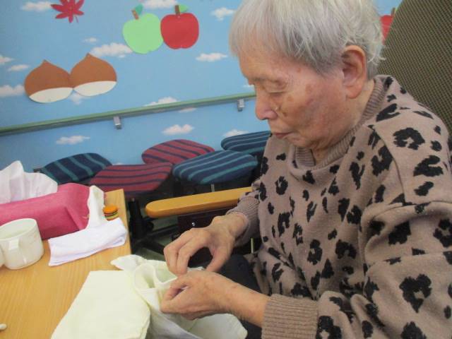 洗顔タオルを丁寧に畳んでいるS様。