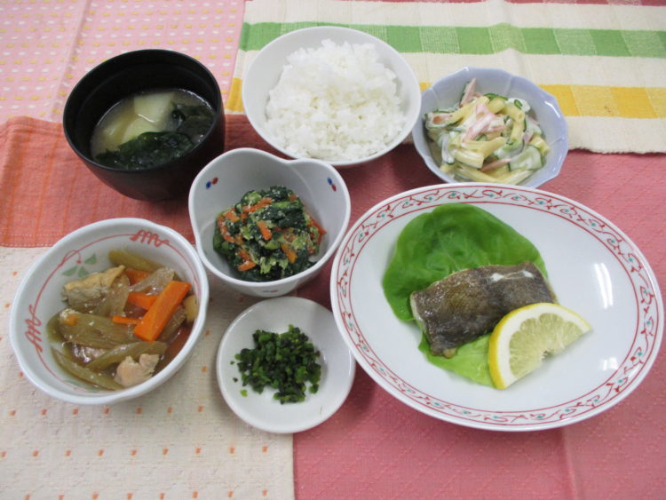 ご飯、じゃが芋とわかめのみそ汁、かれいのムニエル、ふきと鶏肉の煮つけ、マカロニサラダ、小松菜と人参のくるみ和え、青じその実漬