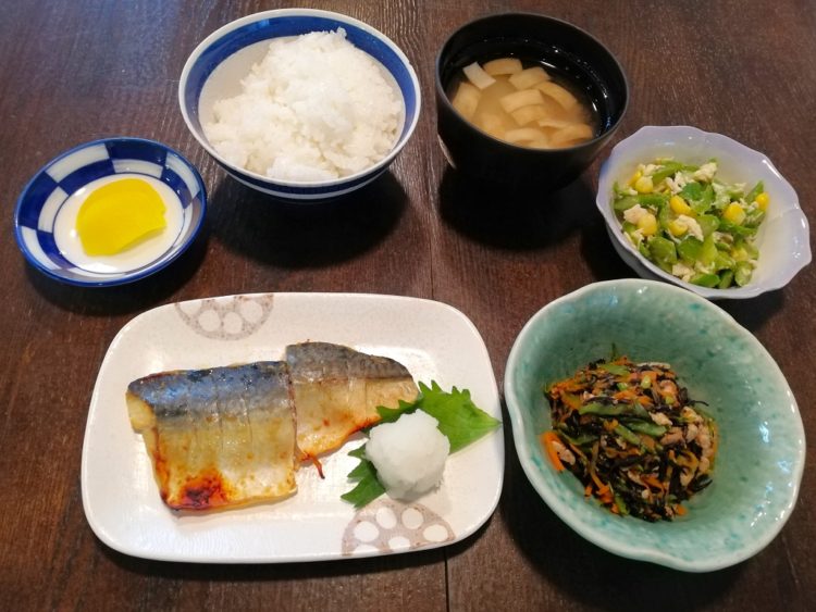 ごはん、もやしのみそ汁、さばの西京焼き、ひじきの炒め煮、アスパラサラダ、たくあん漬け