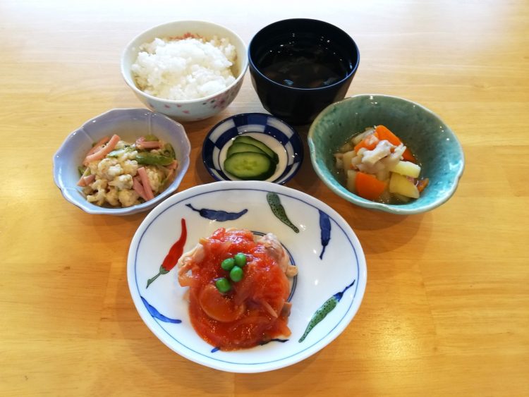 ごはん、椎茸のすまし汁、鶏肉のトマトソースがけ、じゃが芋の煮物、カリフラワーサラダ、