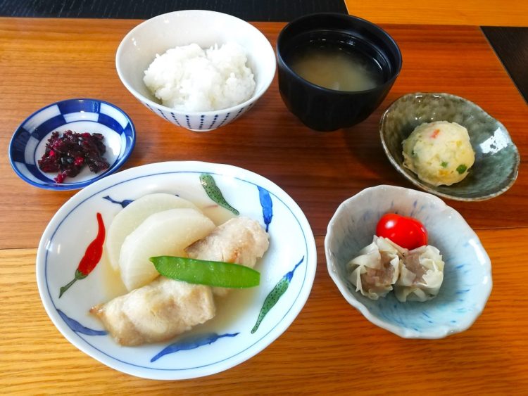 ごはん、ふきのみそ汁、さめの煮つけ、蒸ししゅうまい、ポテトサラダ、しば漬け