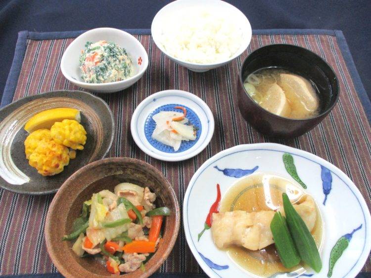 ご飯、棒麩とねぎのみそ汁、赤魚の甘辛煮、豚肉と白菜の炒め煮、とうもろこしのつまみ揚げ、