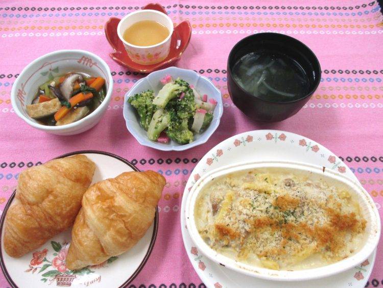 メープルキャラメルクロワッサン、チキングラタン、わかめスープ、