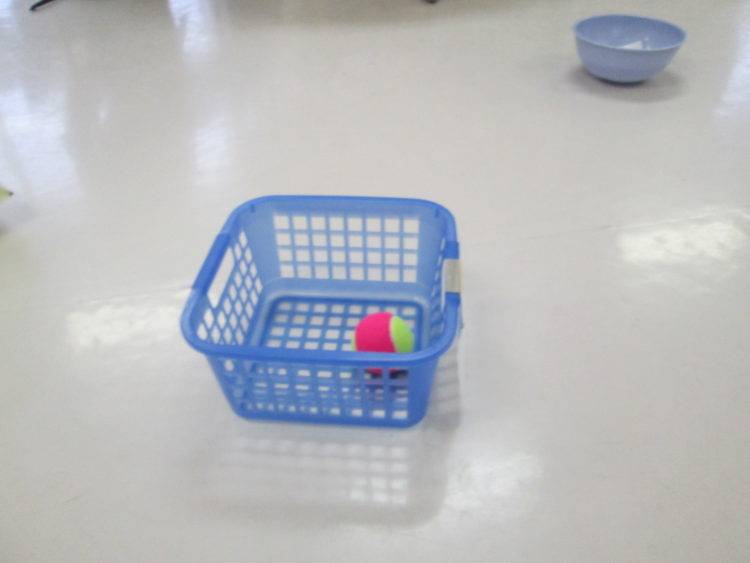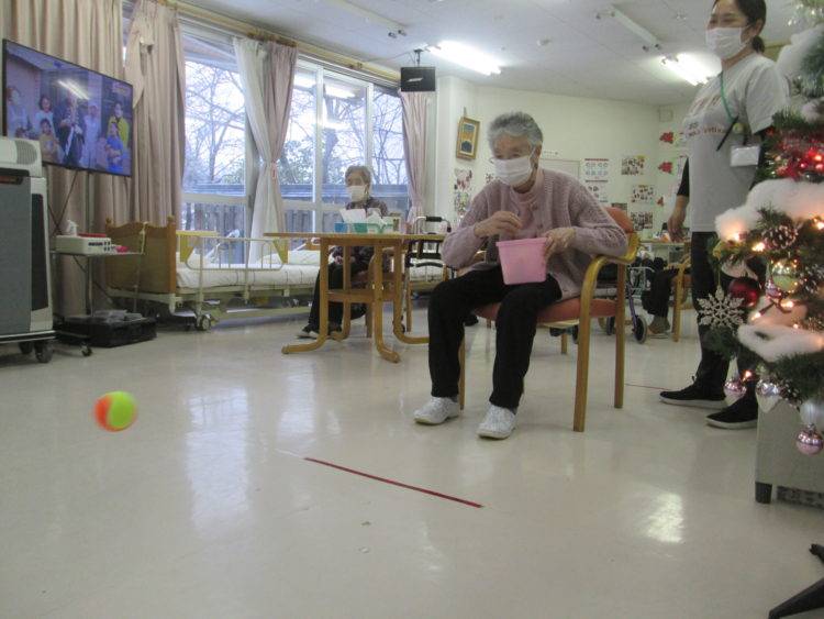 皆様ピンポン玉ではやったことがありますが‥‥今回はテニスボールを使ってのゲーム。ピンポン玉とは勝手が違いコツを掴むのに必死の様子。中々思うように入らず悔しさ半分・楽しさ半分の状態・・・・。さて、K様の番になり狙いを定めていざ投げ入れます。皆様自分のことのように入れと願いボールの行方を見届けます。果たして結果は・・・・・・