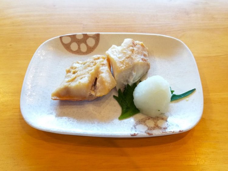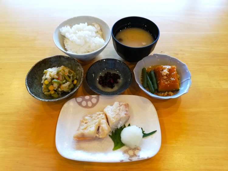 ごはん、玉ねぎのみそ汁、赤魚のごま焼き、南瓜のそぼろあんかけ、カリフラワーの和え物、