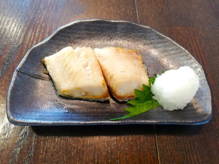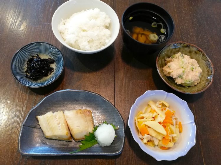 ごはん、しいたけの清汁、ほっけの塩焼き、たけのこの炒め物、里芋のサラダ、しそ昆布
