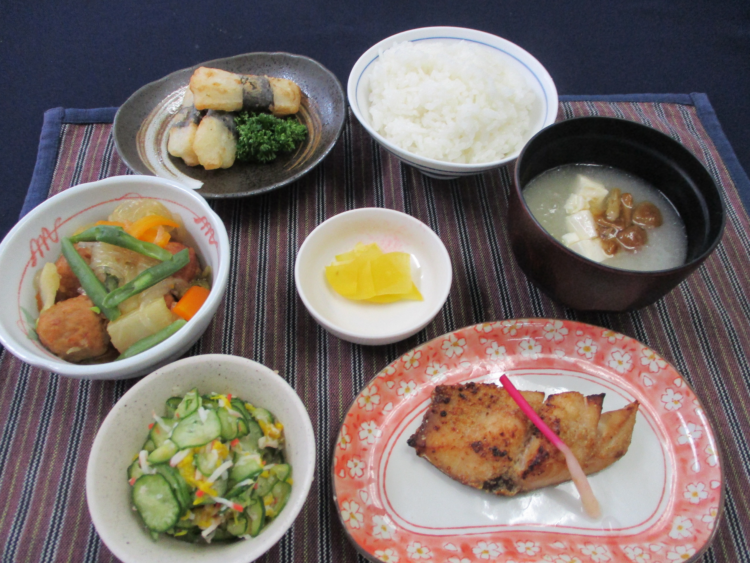 ご飯、豆腐となめこのみそ汁、あじの南部焼き、白菜と肉団子の炒め煮、ながいも短冊揚げ、