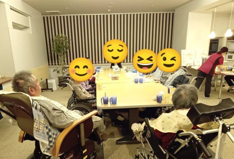 「もうすぐご飯ですね。お腹が空きましたか?」との問いかけに、笑顔で頷かれたり、お茶で喉を潤しながらテレビを観たり、ほかのお客様と談笑されたりと、皆さんご飯を楽しみに待っている様子でした。