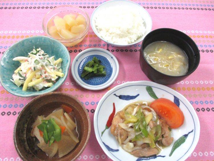 ご飯、長もやしと油揚げのみそ汁、鶏肉の薬味焼き、マカロニサラダ、