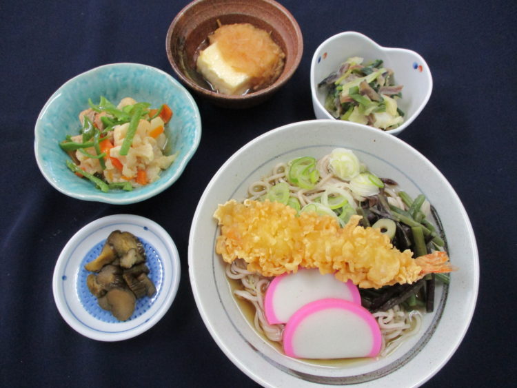年越しそば、カリフラワーと鶏肉の炒め物、身欠きにしん酢味噌和え、