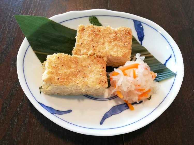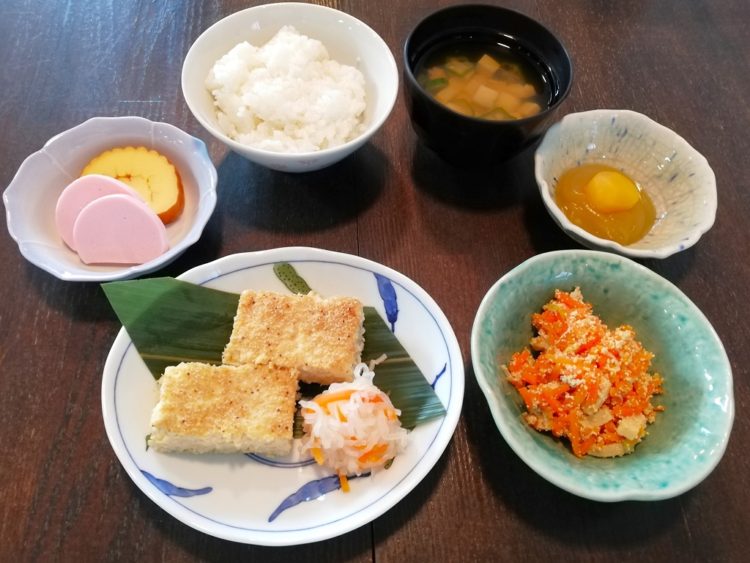 ごはん、オクラのすまし汁、鶏肉の松風焼き、人参の子和え、栗きんとん、伊達巻、かまぼこ