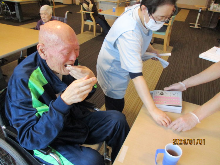 新年明けましておめでとうございます。2024年初の運試しを、大王、いもくじをお客様に引いて頂きました。津軽地方で馴染みのある昔からあるお菓子の為、お客様から「わぁ懐かしいじゃ」「正月昔良くやったなー」と喜ばれていました。その他「どうせ子しか当たんねじゃ」と大王や親が中々当たらない事を悲観されている声も聞かれていましたが、実際やっていると、会場で親や大王が当たると大きな歓声があがり、各々楽しまれていました。本日2階で実施させて頂きました。明日は3階お客様対象に実施させて頂きます。