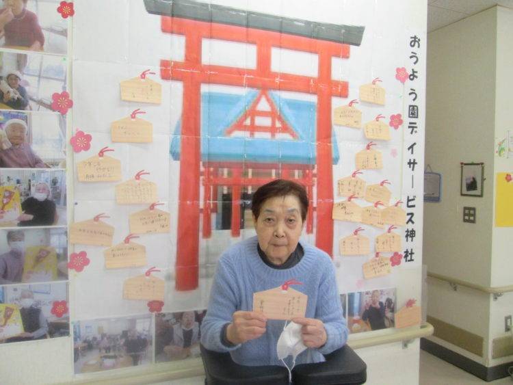 おうよう園デイサービスでは神社を設置してお客様一人一人に絵馬にお願い事を書いてもらいました!