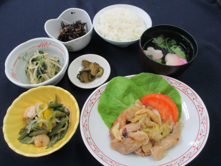 ご飯、花麩と三つ葉の清汁、鶏肉のねぎ味噌焼き、いんげんとえびの炒め物、もやしとほうれん草のナムル、五目ひじき煮、相馬きゅうり漬