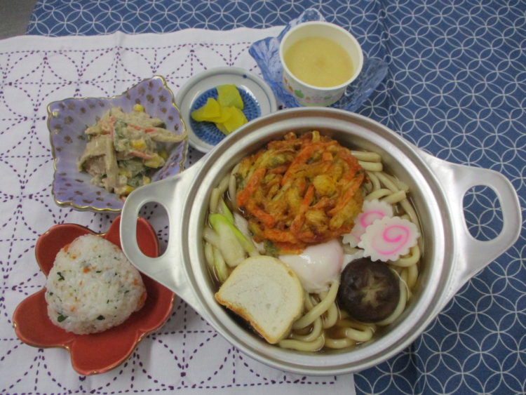 おにぎり、鍋焼きうどん、蒸し鶏と根菜のごまサラダ、かつおたくあん漬、ももゼリー