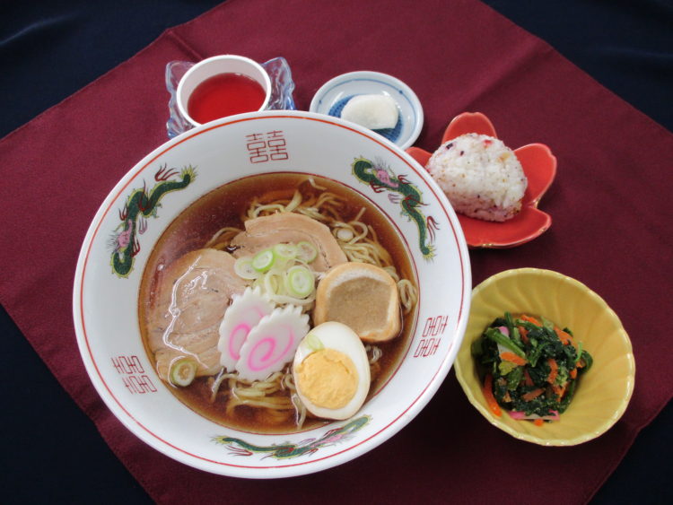 おにぎり、醬油ラーメン、ほうれん草のごま和え、べったら漬、ぶどうゼリー