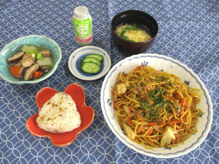 おにぎり、焼きそば、たまごとニラのスープ、かぶと帆立の煮物、きゅうり漬、ラブレ