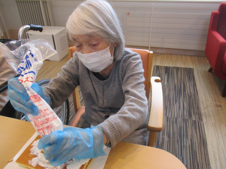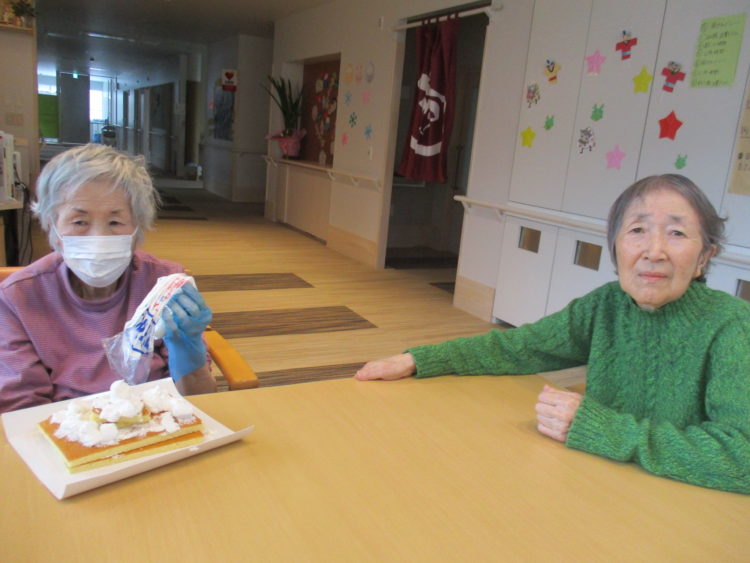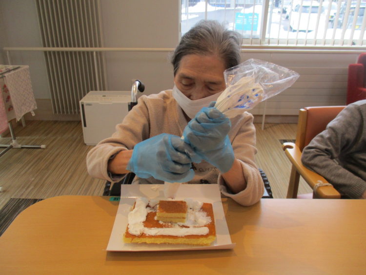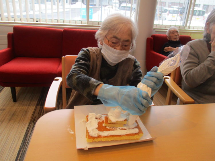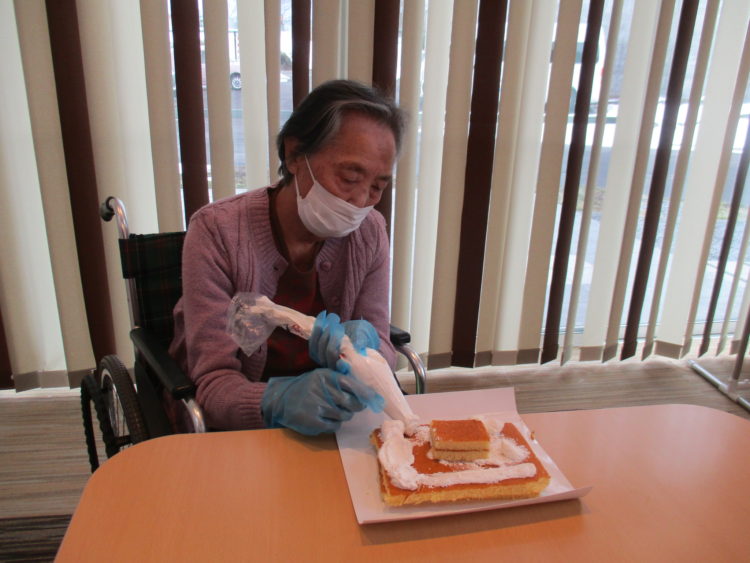 I介護員が考案しました、鏡餅風ケーキでお祝いしました。皆様も、工夫しながら一緒に作業して下さいました。とても美味しく出来上がりましたよ!