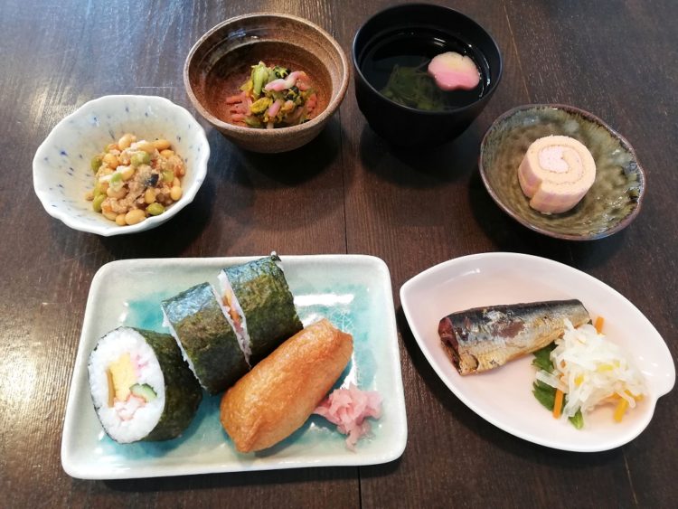 太巻き、いなり寿司、花麩のすまし汁、いわしの梅煮、鶏五目豆、青梗菜の和え物、ロールケーキ