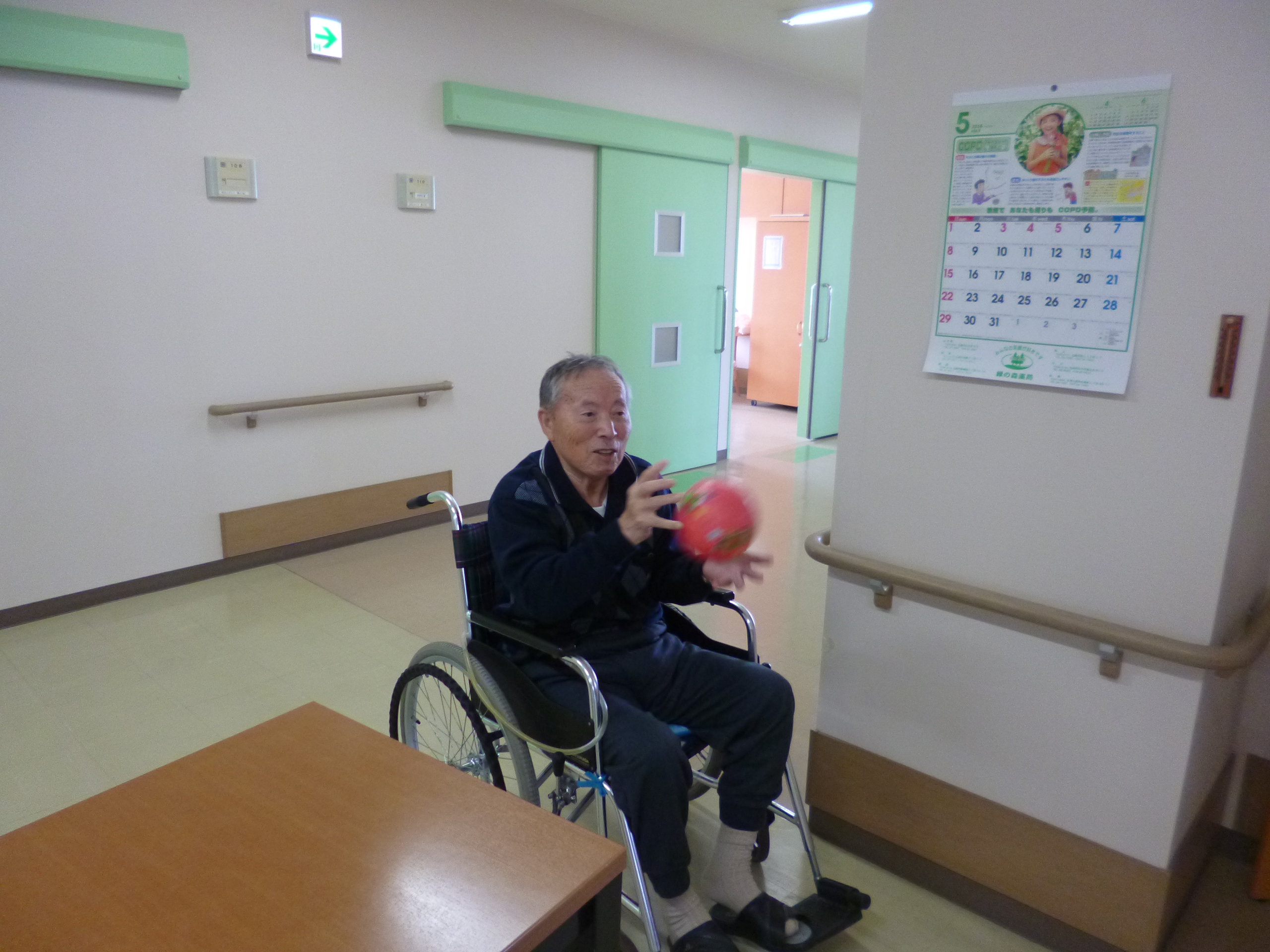 みなさんこんにちわ!今日は新館ショートステイのお役様、I様をご紹介します。I様は明るく、おしゃべり好きな方でスタッフや他お客様からとても人気のある方です。そんなI様と、ボールを使用し上肢の運動をしました!