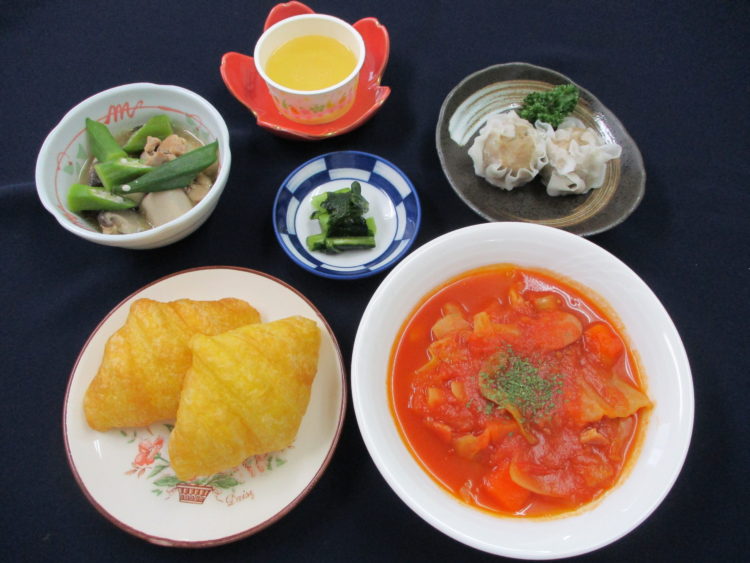 おさつクロワッサン、ミネストローネ、里芋と鶏肉の味噌煮、蒸しシュウマイ、野沢菜漬、りんごゼリー