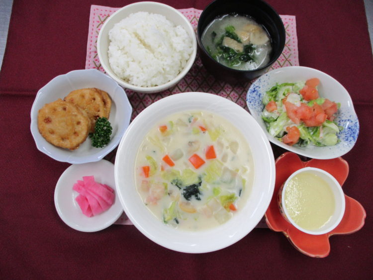 ご飯、クラムチャウダー、アスパラとトマトのサラダ、レンコンはさみ揚げ、赤かぶ漬、ラフランスゼリー