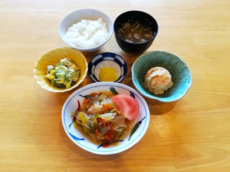 ごはん、舞茸のみそ汁、豚肉の南蛮漬け、卯の花炒り煮、ブロッコリーサラダ、たくあん漬け