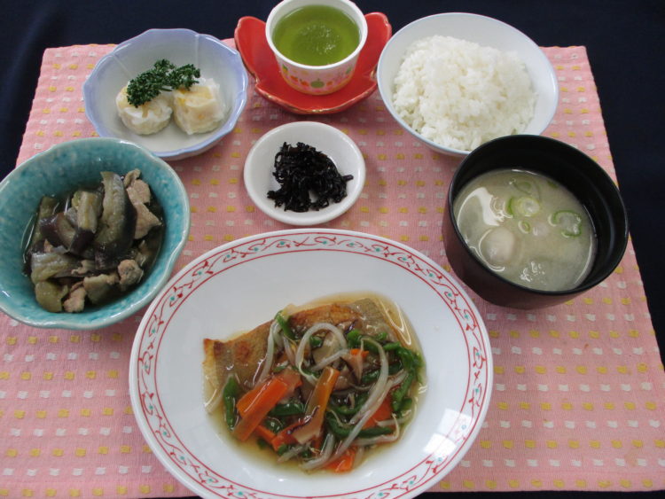 ご飯、里芋とねぎのみそ汁、かれいの甘酢あんかけ、なすの中華風ソテー、コーンシュウマイ、しそ昆布、青りんごゼリー