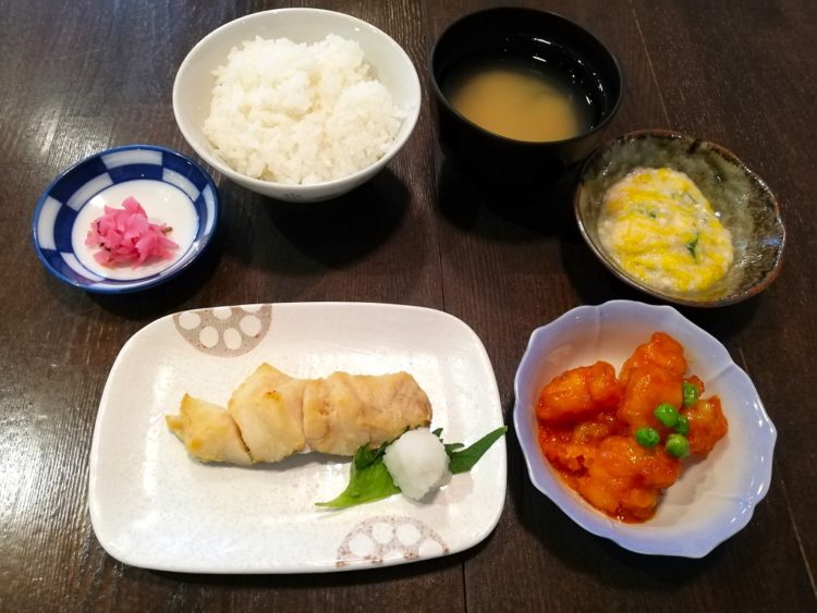 ごはん、あさりのみそ汁、ホキの柚子味噌焼き、えびのチリソース、長芋の酢醤油がけ、梅吹雪