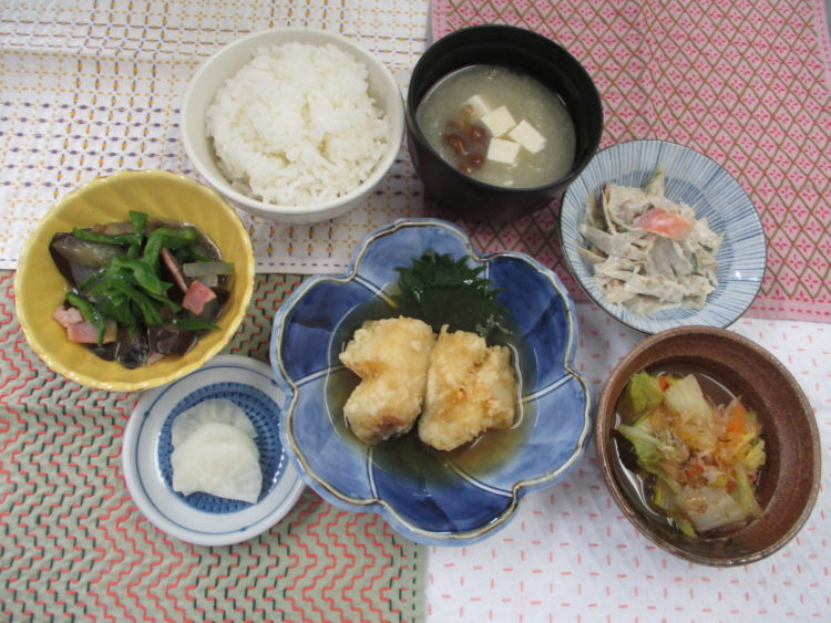 ご飯、豆腐となめこのみそ汁、ホキの揚げ煮、なすとベーコンのソテー、白菜の煮浸し、青森県産ごぼうのサラダ、べったら漬