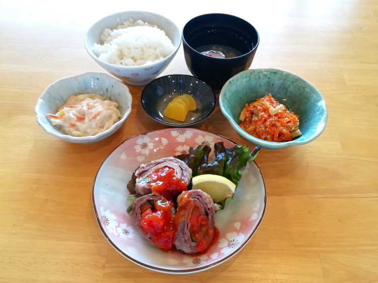 ごはん、オクラのすまし汁、牛肉の野菜巻き、人参の子和え、ゆず大根サラダ、