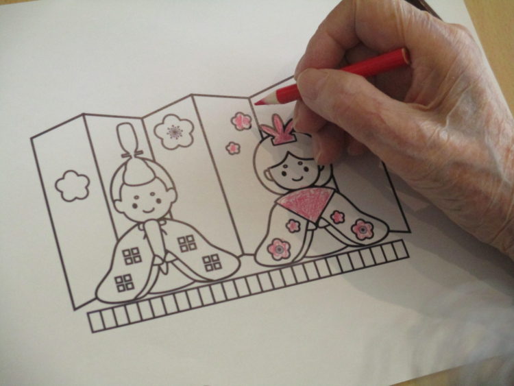 ブログをご覧の皆様こんばんは。今回は3月のひな祭りに向けて、お客様にひな祭りの絵の色塗りをして頂いたのでその様子をご紹介します。