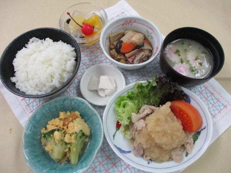 ご飯、なるとと万能ねぎのみそ汁、ブロッコリーのたまご炒め、帆立と高野豆腐の煮物、長芋漬、フルーツみつ豆