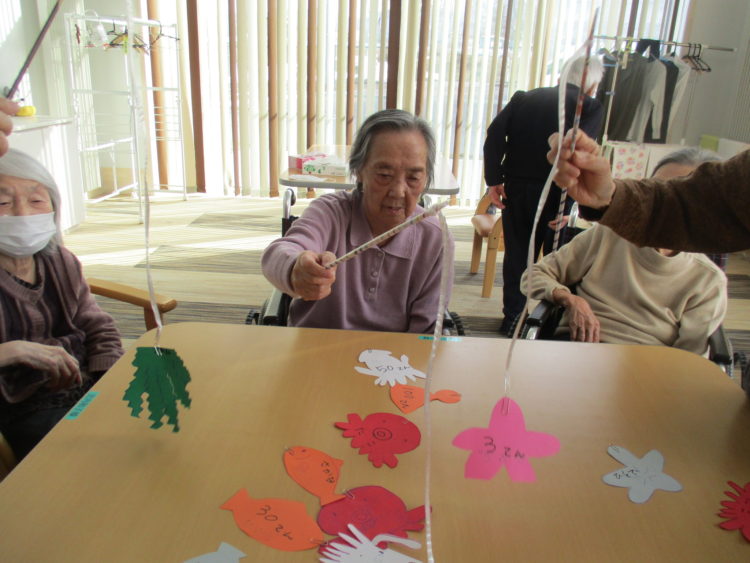始めは「釣りだのってやったことねえ」と見ているだけの利用者様もいざ、取り方を覚えると「わあの方が大きい魚だ」、「ほら、上手だべ」と話しながら楽しそうに行っていました。